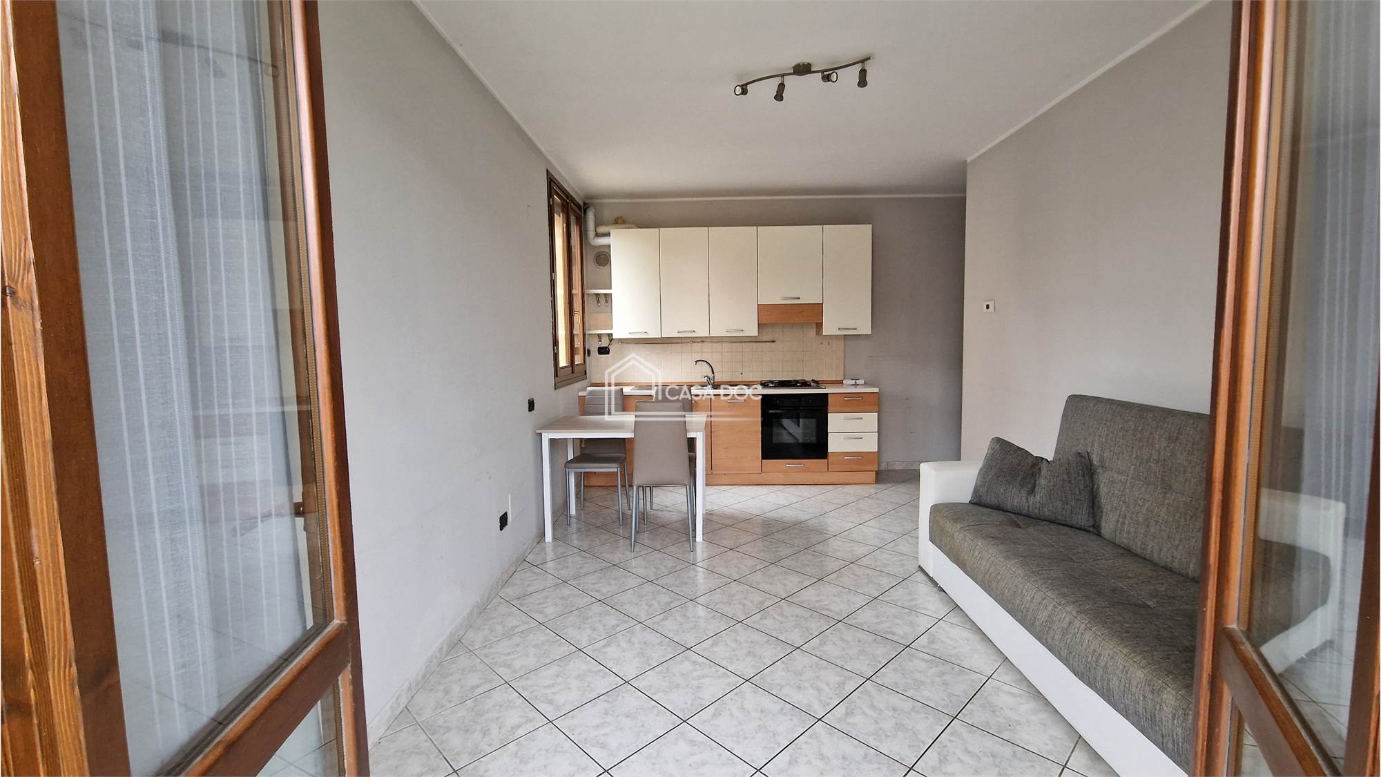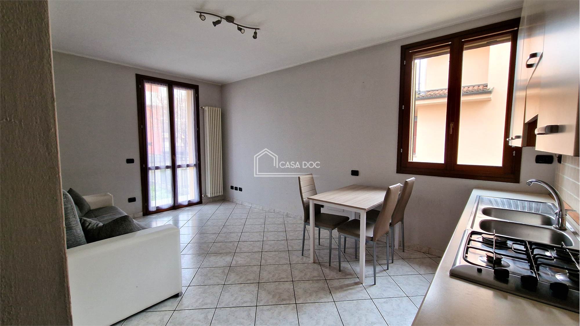 L'ingresso dell'abitazione porta al disimpegno che divide il locale unico con angolo cottura dal bagno preceduto da capiente antibagno. Sul fronte e su un lato del monolocale si trova il giardino privato.